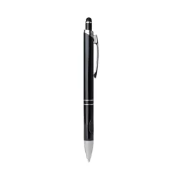 Caneta metálica com touchscreen, com detalhe emborrachado na parte inferior, carga esferográfica azul de 1.0 mm e acionamento por clique.