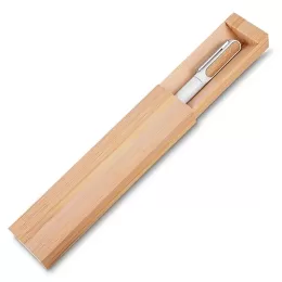 Descrição: Conjunto caneta de metal com detalhes em bambu e estojo de papel. Carga esferográfica azul e acionamento por clique.