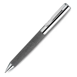 Descrição: Caneta metálica com estojo em tecido RPET. A caneta possui carga esferográfica azul, acionamento por rotação e corpo com detalhe em RPET.