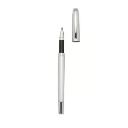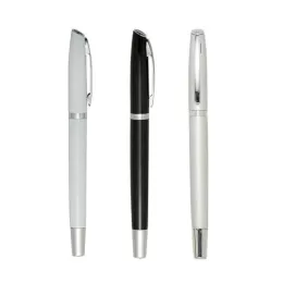 Descrição: Caneta metal roller com tampa, inteira colorida e detalhes em prata. Clip(metal) e parte superior em prata, possui anel e parte inferior também prateado.