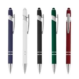 Descrição: Caneta metálica touchscreen com acabamento similar à borracha, acionamento por clique e carga esferográfica azul 1.0mm.