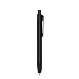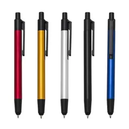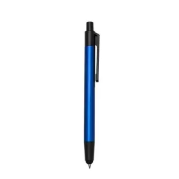 Caneta touch metal inteira colorida com detalhes preto. Clip plástico, possui touch e caneta esferográfica. Aciona por clique, esferográfica sai por dentro do touch.