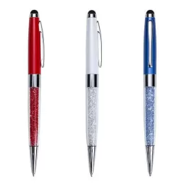 Descrição: Caneta metal touch, parte inferior em plástico transparente com cristais(swarovski) interno. Clip metal e ponteira touch superior, cristal da mesma cor que o detalhe colorido da parte inferior. Aciona por giro. OBS.: PEDIDO APENAS MÚLTIPLO DE 50 PEÇAS!
