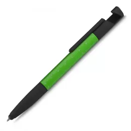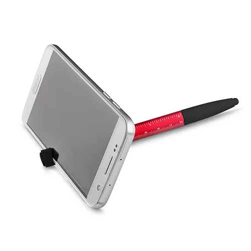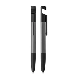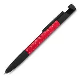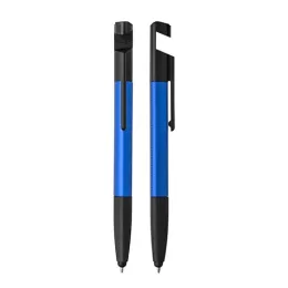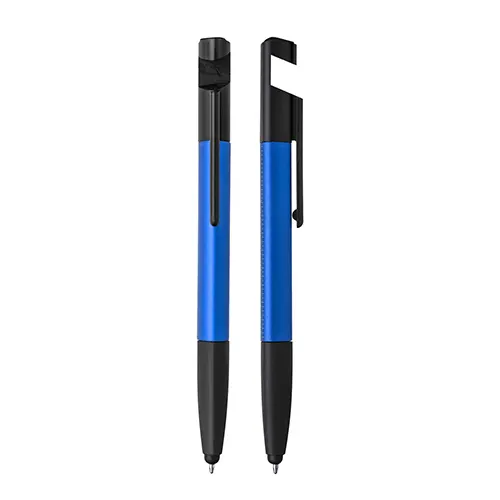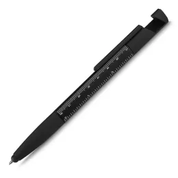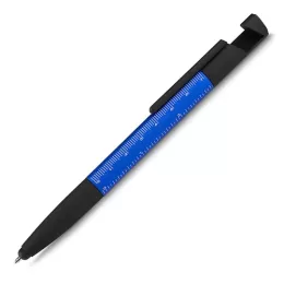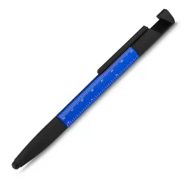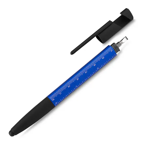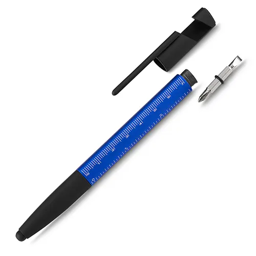 Caneta esferográfica metálica com escrita azul, ponta touch e funções integradas: chave de Fenda e Phillips, Suporte para smartphone, limpador de tela no acionador e régua no corpo da caneta.