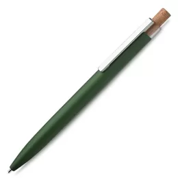 Caneta esferográfica em alumínio reciclável com escrita em azul. Refil parker e acionador em bambu.