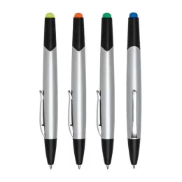 Caneta plástica com marca texto inteira prata com detalhes preto. Clip de metal, para utilizar marca texto basta puxar a tampa preta aonde possui um detalhe colorido sinalizando o marca texto e do outro lado esferográfica aciona por giro.