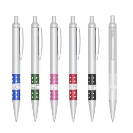 Descrição: Caneta plástica inteira prata com detalhes inferiores coloridos. Possui clip de metal com 3 cortes superiores, vinte e oito pedras strass com anel em relevo no centro. Aciona por clique.