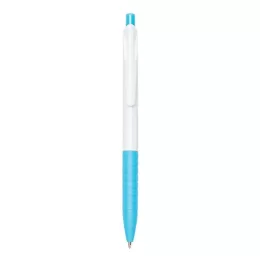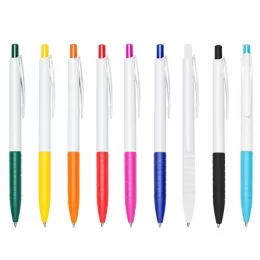 Descrição: Caneta plástica branca com detalhes coloridos. Clip plástico com detalhe vazado nas laterais, acionador e parte inferior colorida com oito anéis em relevo. Aciona por clique.