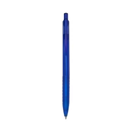 Descrição: Caneta plástica translúcida inteira colorida. Clip plástico com detalhe vazado nas laterais, acionador e parte inferior preta com oito anéis em relevo. Aciona por clique.