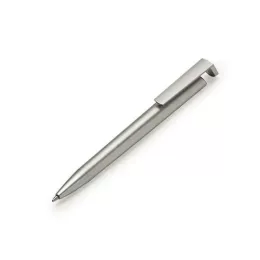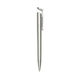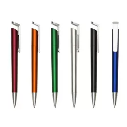 Caneta plástica colorida com detalhes prata. Clip plástico prata utilizado como suporte para celular. Aciona por clique.
