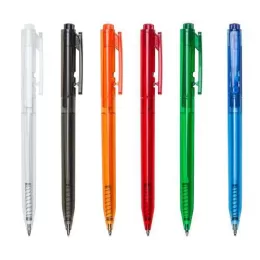 Descrição: Caneta plástica translúcida inteira colorida. Acionador com detalhes em relevo e clip plástico, aciona por clique e para destravar basta apertar a parte inferior do clip.