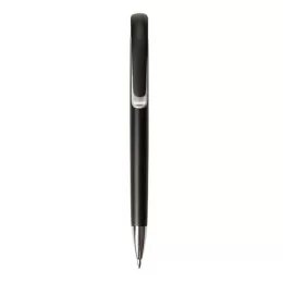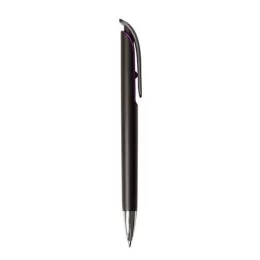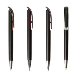 Caneta Plástica 13830 na cor preto fosco com detalhe colorido ao redor do clip, ponteira prata. Aciona por clique.