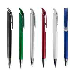 Caneta Plástica 13830B na cor colorida fosca com detalhe prata ao redor do clip e na ponteira. Aciona por clique.