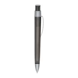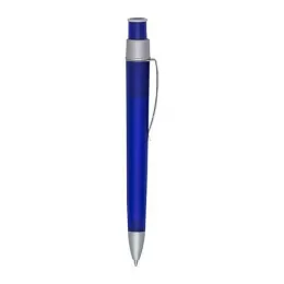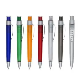 Caneta plástica fosca inteira colorida com detalhes prata. Possui relevo abaixo do acionador e clip de metal. Aciona por clique.
