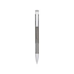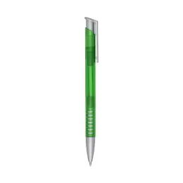 Caneta plástica prata com detalhes coloridos translúcidos. Clip plástico prata e parte inferior com sete linhas prata. Aciona por clique.