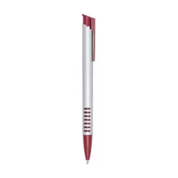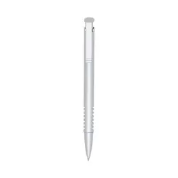 Caneta plástica corpo prata com detalhes coloridos. Clip plástico colorido e parte inferior com sete linhas coloridas. Aciona por clique.