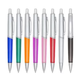Caneta plástica inteira colorida com detalhes prata. Possui clip de metal com detalhe plástico preto, parte inferior com três anéis coloridos. Aciona por clique.