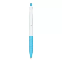 Descrição: Caneta plástica branca com detalhes coloridos. Clip plástico com detalhe vazado nas laterais, acionador e parte inferior colorida com oito anéis em relevo. Aciona por clique.