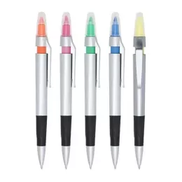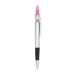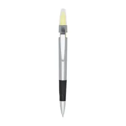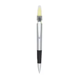 Caneta plástica esferográfica e marca texto com corpo prata. Possui tampa protetora no marca texto e detalhe emborrachado com relevo na parte inferior. Aciona por clique.