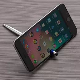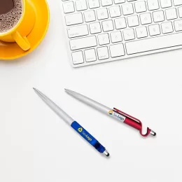 Caneta Plástica Touch com Suporte para celular. Corpo prata com detalhe colorido, clip plástico e borracha touch superior. Aciona por giro.