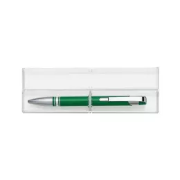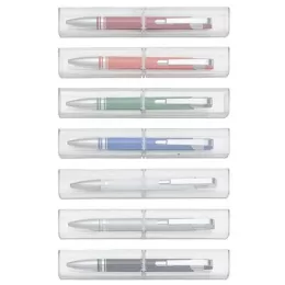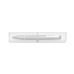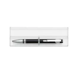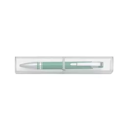 Caneta semi metal com tubo de acrílico retangular. Caneta inteira colorida com detalhes prata, clip metal, possui 3 anéis na parte inferior e aciona por clique. No tubo há uma espécie de “anel” emborrachado para sustentar/encaixar a caneta. observação: Tubo 15,7 cm x 2,5 cm – Caneta 13,7 cm x 1,4 cm