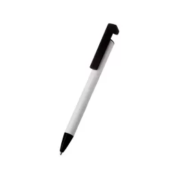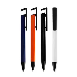 Descrição: Caneta semimetálica com suporte para celular, carga esferográfica azul e acionamento por clique.