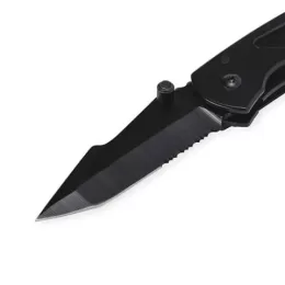 Descrição: Canivete metal 11 funções com detalhes emborrachados preto(três linhas frente e verso). Possui: lâmina de corte, serrilha, serra madeira, mini tesoura, abridor de latas, abridor de garrafa, chave phillips, lamina de remoção e limpeza, lixa, agulha de sutura e saca-rolhas. Acompanha bainha em nylon.