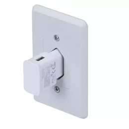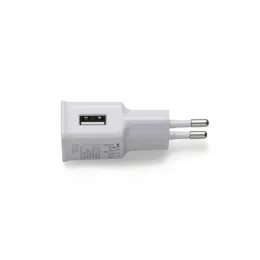 Descrição: Carregador tomada plástico branco. Para utilizar basta conectar cabo USB(não acompanha) no adaptador e ligar à energia, compatível com todos aparelhos. Entrada 100-240V, frequência 50-60Hz e saída 5V-2A. Parte frontal lisa e parte traseira com especificações técnicas.