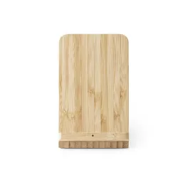 Carregador wireless de bobina dupla em bambu com suporte para esferográficas. Potência de carregamento rápida de 10W e com entradas 5V/2A e 9V/1.67A. Incluso cabo de carregamento USB tipo C de 1m. Fornecido em caixa de papel kraft. 77 x 71 x 118 mm