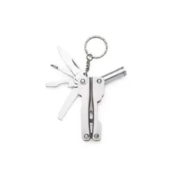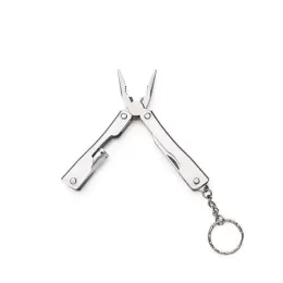 Descrição: Chaveiro alicate metal 5 funções. Possui: lanterna(basta rotacionar sua ponta para acender/apagar), lâmina de corte, chave philips, abridor de lata e serrilha. Acompanha bainha em nylon.