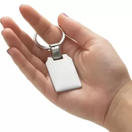 Descrição: Chaveiro metal retangular brilhante, frente e verso iguais, suporte da argola giratório.