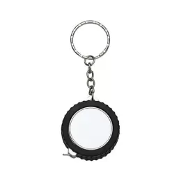 Chaveiro trena 1 metro formato pneu fosco, material emborrachado com relevo. Detalhes do aro em plástico prata, verso liso. Trena não possui trava.