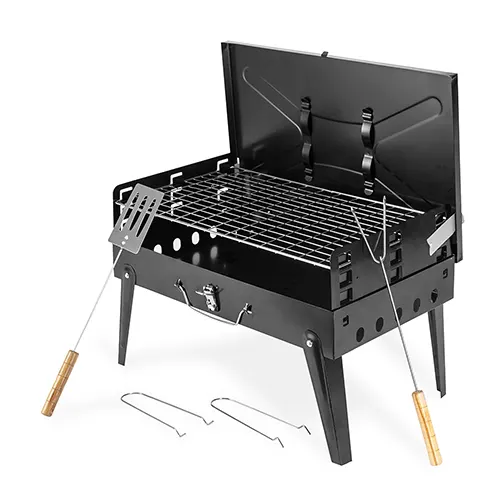 Descrição: Churrasqueira feita em metal com funcionamento a carvão.Possui formato compacto e pode ser transportada como uma maleta quando desmontada, além de alça para transporte, trava de segurança para fechamento e quatro pés retráteis. Acompanha uma espátula e espeto duplo com cabo em madeira.