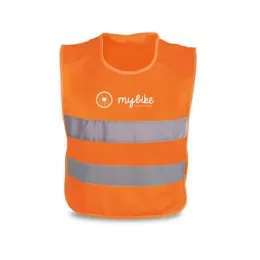 Colete refletivo para criança em poliéster (100%). Contém 2 bandas retrorrefletivas horizontais, fecho com velcro lateral e é certificado pela norma EN 17353. Produto não destinado para uso profissional. Tamanho único: 370 x 470 mm