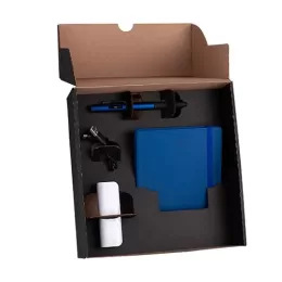 DESCRIÇÃO: Kit composto por caderno para anotações azul com capa dura, caneta esferográfica em ABS azul e carregador portátil USB em plástico ABS para celular/smartphone/Tablet.