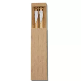Descrição: Conjunto caneta e lapiseira de bambu em estojo de papel. Caneta e lapiseira com detalhes plásticos e clip em formato de folha, aciona por clique.