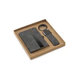 Conjunto composto por um porta-cartões e um chaveiro, ambos em metal e poliéster 30% reciclado. O porta-cartões tem capacidade até 7 cartões. Fornecido em caixa presente de papel kraft reciclado. Chaveiro: 25 x 115 x 6 mm | Porta-cartões: 95 x 65 x 15 mm | Caixa: 125 x 135 x 17 mm