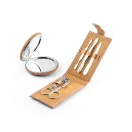 Conjunto de manicure em cortiça com cinco peças em aço inoxidável: lixa, tesoura, cortador de unhas, pinça e empurra cutículas. Fornecido em bolsa de papel natural. 104 x 61 x 17 mm