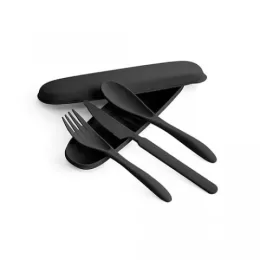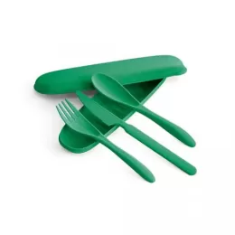 Conjunto de talheres. Fibra de bambu e PP. 3 talheres: garfo, faca e colher. Incluso estojo. Food grade. 205 x 65 x 25 mm