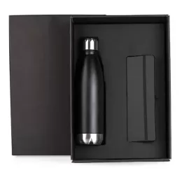 DESCRIÇÃO: Conta com caderno para anotações preto com capa dura e garrafa em aço Inox preta com tampa rosqueável e capacidade de 750ml.