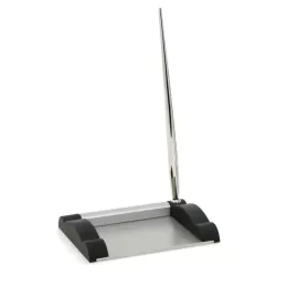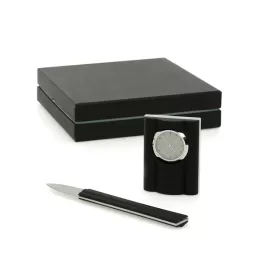 Conjunto para Mesa de Escritório. Metal e acrílico. 4 peças: relógio de mesa, extrator de grampo, porta papel e esferográfica. Incluso bloco. Caixa: 225 x 225 x 58 mm