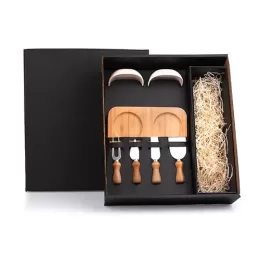 DESCRIÇÃO: Kit para petisco. Conta com base em bambu; conjunto para queijo/petisco sendo duas facas, uma espátula e um garfo em bambu/inox; dois potes em fibra de bambu.