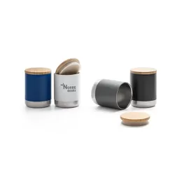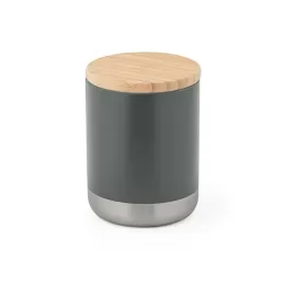 Copo em aço inox com parede dupla isolada a vácuo, parede interna revestida de cobre e tampa em bambu com vedante de silicone para proteção extra. Tem capacidade até 370 ml e mantém as bebidas quentes por 5 h e frias por 24 h. Contém revestimento em pó que lhe confere mais durabilidade e resistência. Food grade. Fornecido em caixa presente de papel craft. ø80 x 106 mm