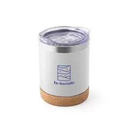 Copo de viagem em aço inoxidável com parede dupla isolada a vácuo, acabamento fosco e base em cortiça (térmico). Contém uma tampa transparente com fecho deslizante. Capacidade até 400ml. Food grade. Fornecido em caixa presente kraft. Ø93 x 121 mm