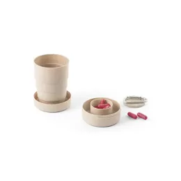 Copo de viagem retrátil em fibra de bambu (50%) e PP (50%) com capacidade até 210 ml. Incluso caixa para comprimidos e mosquetão. ø65 x 33 mm