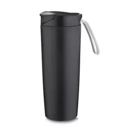 400ml de pintura preto fosco com alça emborrachada colorida. Tampa rosqueável com abertura de bocal, parte inferior do produto possui ventosa.