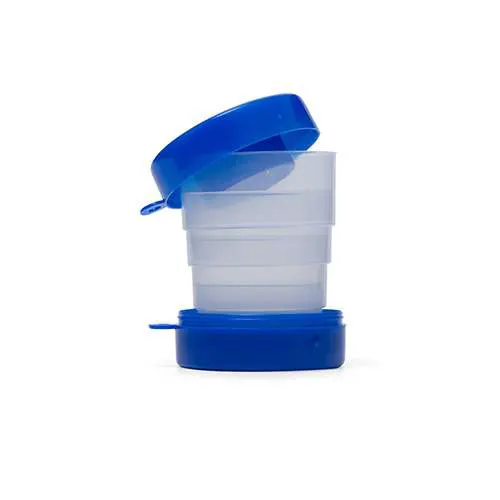 Descrição: Copo retrátil 200ml de plástico com tampa porta comprimido e base colorida. Basta puxar para cima para “armar” o copo, possui “suporte” para chaveiro. Na área interna da tampa possui um compartimento para comprimidos, basta rosquear a tampa interna para abrir/fechar.