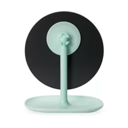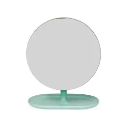 Descrição: Um espelho de mesa com estilo minimalista que se adapta a diversos ambientes. Possui base fixa e pedestal giratório em 360 graus, ambos feitos em plástico, permitindo uma montagem simples e o ajuste em diferentes ângulos e posições.