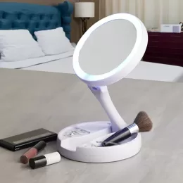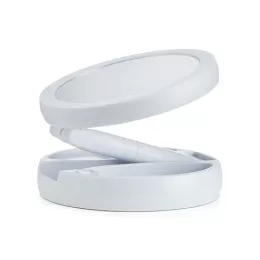Descrição: Espelho Dobrável com LED Recarregável e dupla face, material plástico. O espelho possui uma das faces ampliada 10x e do outro lado, espelho convencional 1x, iluminação LED dos dois lados, três compartimentos na base para armazenamento de acessórios, espelho giratório e regulável, botão liga/desliga e botão para acionar a iluminação, com funcionamento à base de 4 pilhas AA ou via cabo USB. Acompanha antiderrapantes emborrachados.