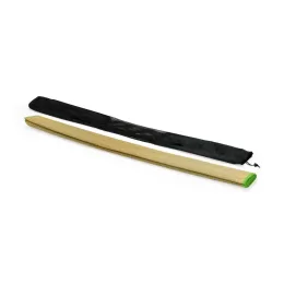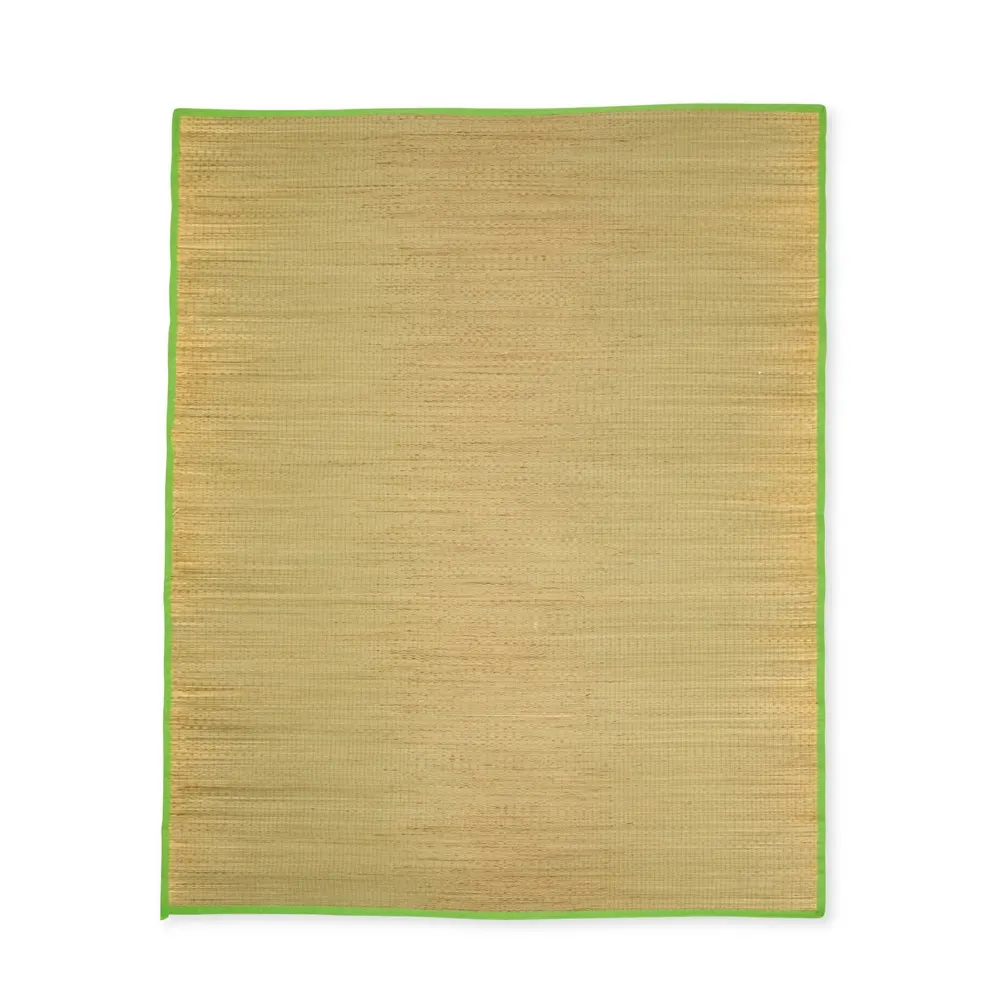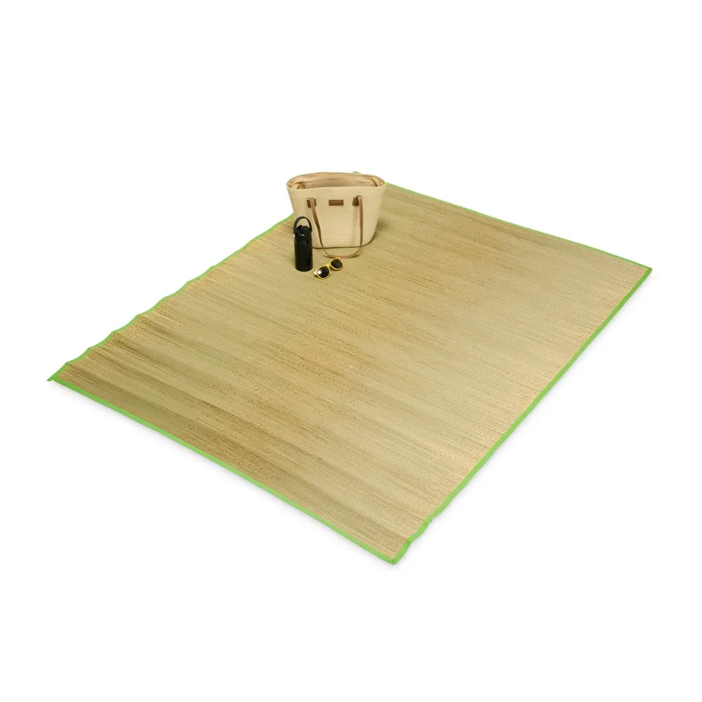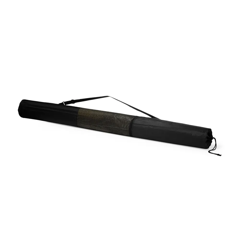 Esteira leve em palha sintética com bordas costuradas em nylon. Acompanha saco de nylon com seção telada, cordão de fechamento e alça regulável para transporte.